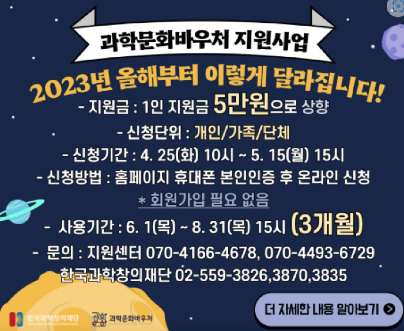 한국과학창의재단 지역과학문화팀 과학문화바우처 담당자(02-559-3835 / 3870 / 3826)