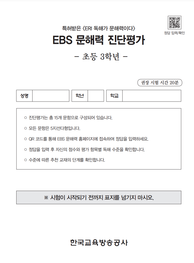 이 테스트는 ebs에서 제공하는 것으로 초등학교 3학년부터 중학교 1학년까지 각 나이에 맞게 할 수 있습니다.