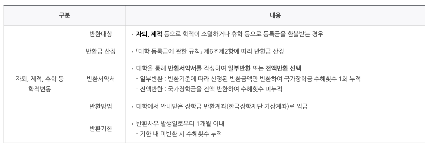 경우 1. 자퇴, 휴학시 국가장학금 반환